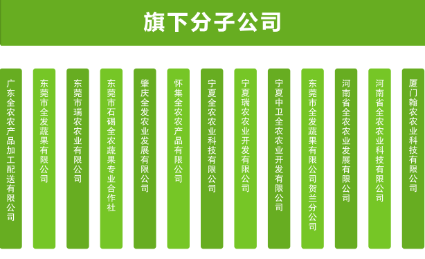 廣東全農(nóng)農(nóng)業(yè)(集團(tuán))有限公司創(chuàng)建于 1989 年,深耕農(nóng)業(yè) 30余載,是一家專(zhuān)注于農(nóng)產(chǎn)品產(chǎn)業(yè)鏈建設(shè)及運(yùn)營(yíng)的專(zhuān)業(yè)蔬菜集團(tuán)公司,被認(rèn)定為東莞市優(yōu)秀農(nóng)業(yè)龍頭企業(yè),廣東省重點(diǎn)農(nóng)業(yè)龍頭企業(yè)?,F(xiàn)有寧夏全農(nóng)、寧夏瑞農(nóng)、河南全農(nóng)、廈門(mén)翰農(nóng)等下屬公司十三家,公司實(shí)力雄厚,資源豐富,產(chǎn)品銷(xiāo)售網(wǎng)絡(luò)遍及華南、直通港澳、遠(yuǎn)銷(xiāo)海外;現(xiàn)已形成以蔬菜種植、加工、冷鏈、物流及配送為核心的產(chǎn)業(yè)集群和銷(xiāo)售網(wǎng)絡(luò)。